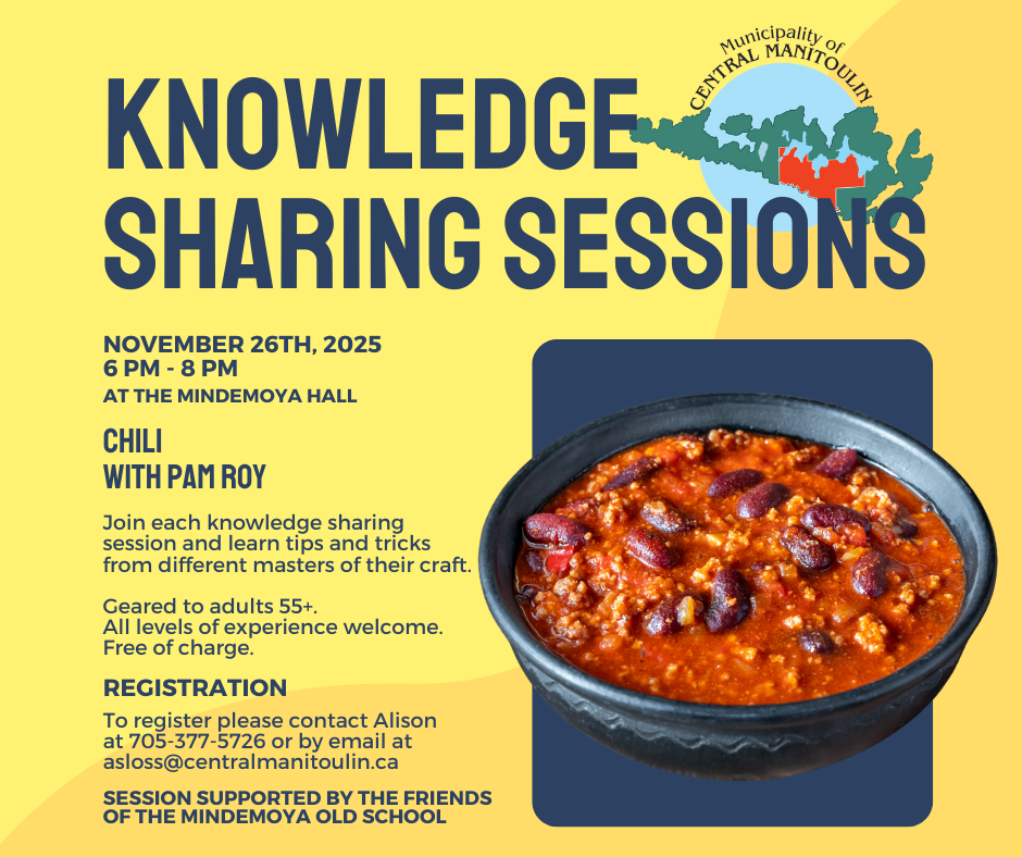 On Wednesday, November 26th from 6 - 8 pm at the Mindemoya Hall, Pam Roy will be joining us to share her tips and tricks on how to make delicious chili! To join in, please register with Alison by emailing asloss@centralmanitoulin.ca or by calling...